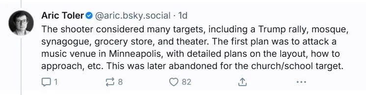Extremism experts have noted material the shooter left behind fits the pattern of a nihilistic online subculture that idolizes mass shooters. In replies on Bluesky to Assigned Media’s Evan Urquhart, New York Times reporter Aric Toler (who co-bylined an NYT story on the shooter) shared that the original target the shooter had planned to attack was an underground trans music venue.