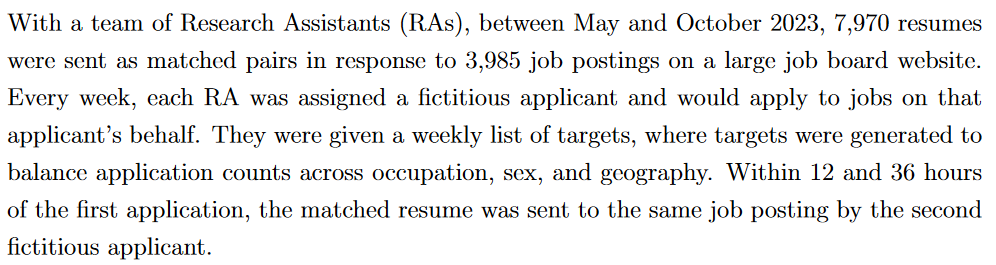 Here, with the caveat that peer review may turn up errors our reporting did not, the methods this paper uses seem to be well regarded in the literature and not misapplied or out of place. If anything, this paper goes above and beyond the standard set for previous ones. For instance, this paper gives a detailed assessment of the process for creating the fake resumes used within the appendix, describing everything from the intricate layout of the resume pages to the randomization process used.